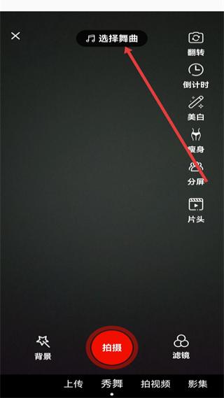 2、在拍攝的界面,需要點(diǎn)擊頂部的選擇舞曲,進(jìn)入舞曲選擇的頁面。
