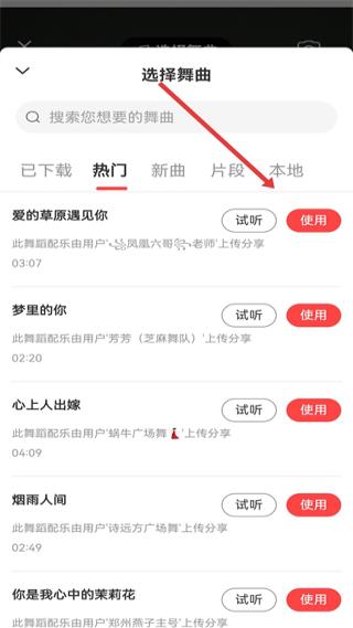 3、在舞曲選擇頁面如熱門舞曲列表,找到想要的同款舞曲,點(diǎn)擊使用就可以拍攝同款舞蹈視頻。
