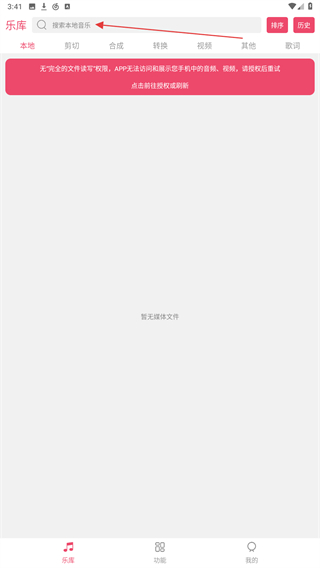 1、打開音樂剪輯大師APP,在首頁內(nèi)點(diǎn)擊上方搜索的區(qū)域。