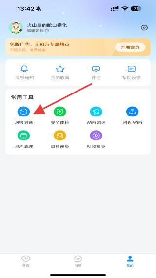 2、在我的頁面的常用工具區(qū)域,點擊網絡測速圖標,進入測速界面。