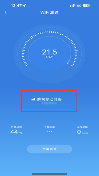 3、進入WiFi測速頁面后,系統會自動開始檢測網絡速度,等待幾秒后即可查看下載速度網絡延遲、上傳速度等數據。