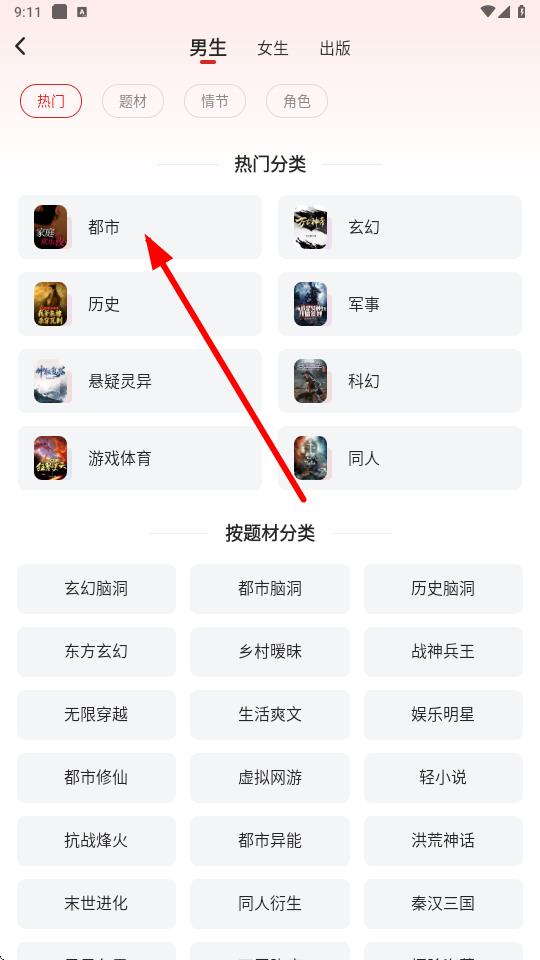 2、在書城頁(yè)面點(diǎn)擊分類,選擇如都市等感興趣的分類。