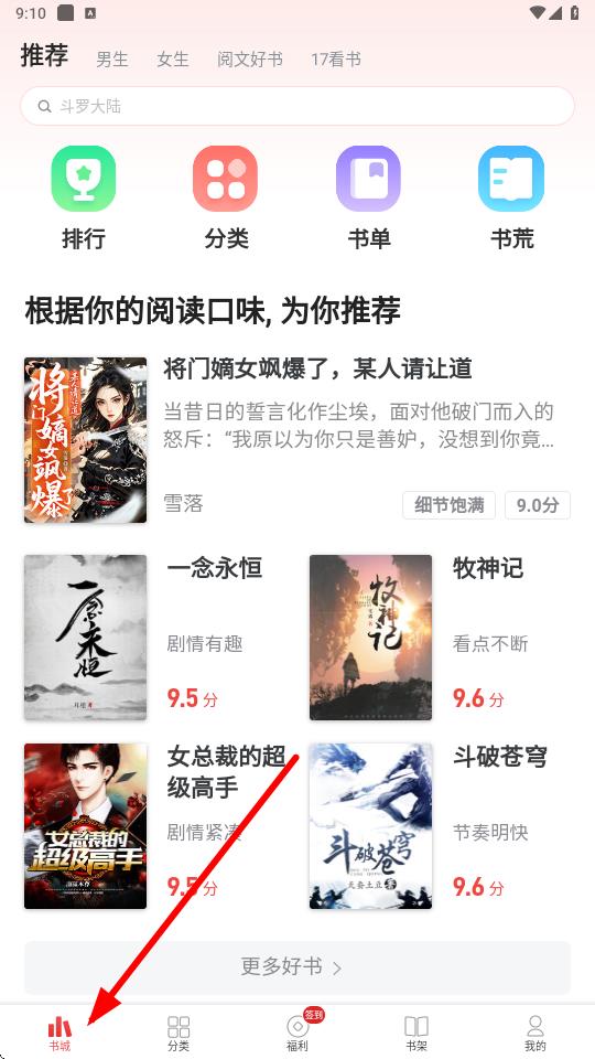1、打開(kāi)追書神器點(diǎn)擊底部書城進(jìn)入書城頁(yè)面。