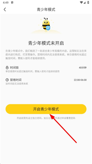 4、在青少年模式頁(yè)面,點(diǎn)擊開(kāi)啟青少年模式按鈕,按照提示設(shè)置獨(dú)立密碼后,即可成功開(kāi)啟青少年模式。