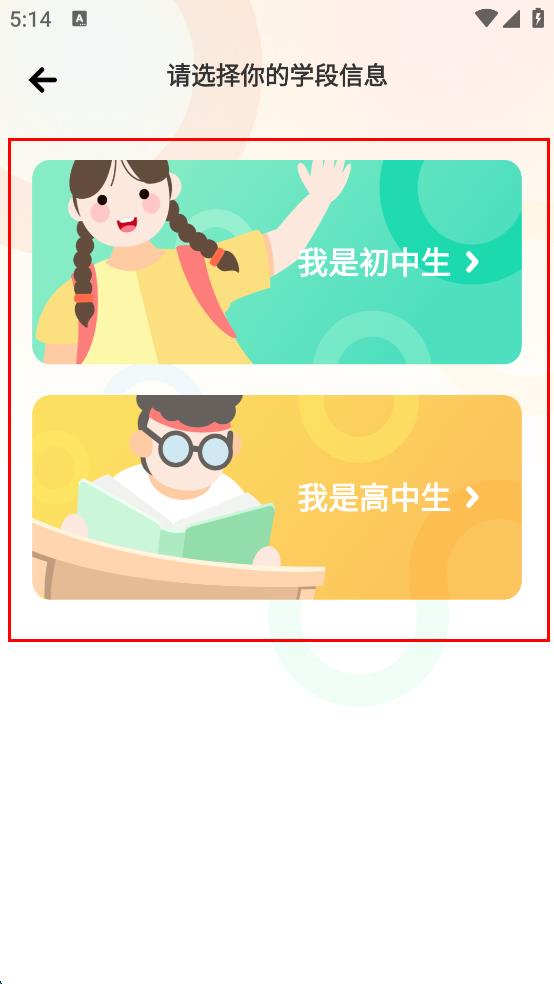 4、在學(xué)段信息選擇頁面,根據(jù)自身情況,選擇“我是初中生”或“我是高中生”,完成學(xué)段選擇后,即可進(jìn)入APP主界面,開始使用相關(guān)英語學(xué)習(xí)功能。