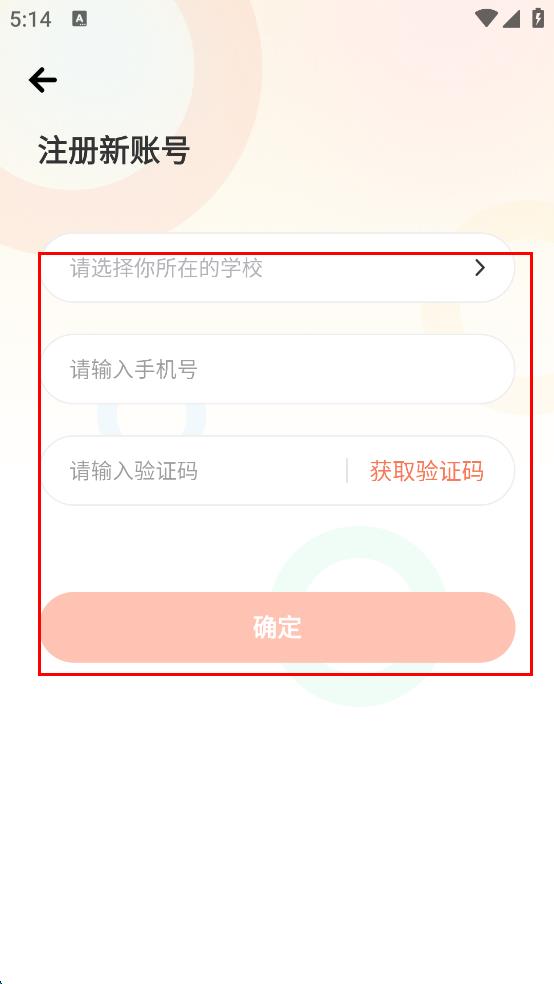 3、在注冊新賬號頁面,選擇所在學(xué)校,輸入手機(jī)號碼,獲取并輸入驗(yàn)證碼,然后點(diǎn)擊“確定”按鈕,完成賬號注冊,接著進(jìn)入學(xué)段信息選擇頁面。