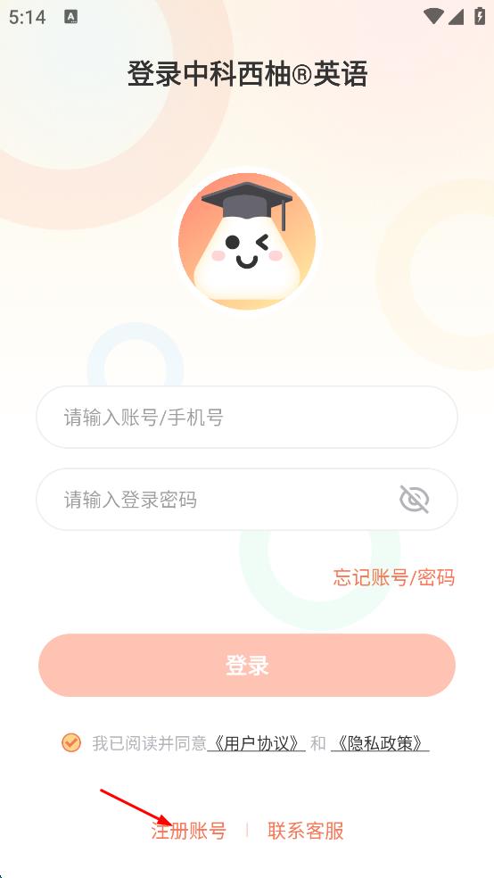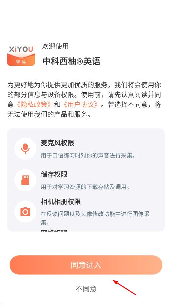 1、打開中科西柚英語APP,彈出權(quán)限及協(xié)議提示頁面,仔細(xì)閱讀隱私政策和用戶協(xié)議后,點(diǎn)擊“同意進(jìn)入”按鈕,進(jìn)入登錄或注冊頁面。