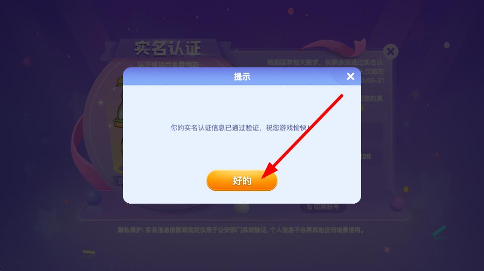 2、提交認(rèn)證后,系統(tǒng)會對輸入的實(shí)名認(rèn)證信息進(jìn)行驗(yàn)證,點(diǎn)擊好的按鈕,完成實(shí)名認(rèn)證流程的確認(rèn)。