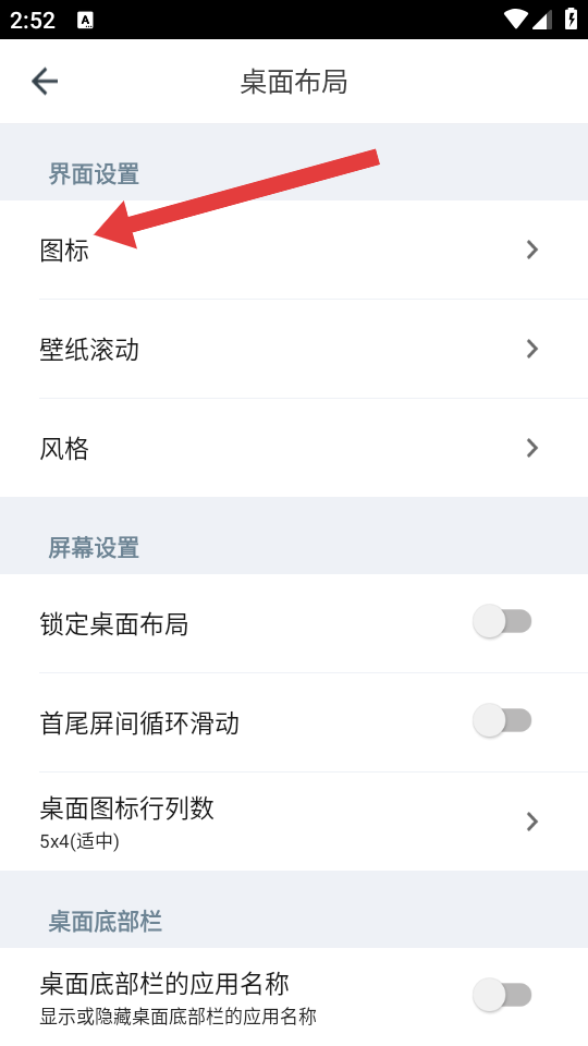 3、在桌面布局的頁面,需要點擊圖標的選項,進入圖標設(shè)置的頁面。