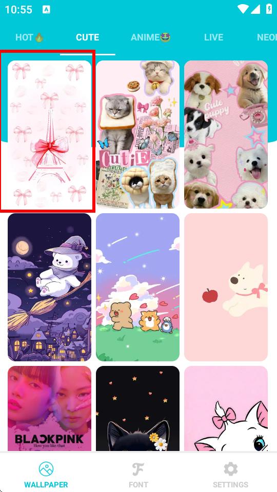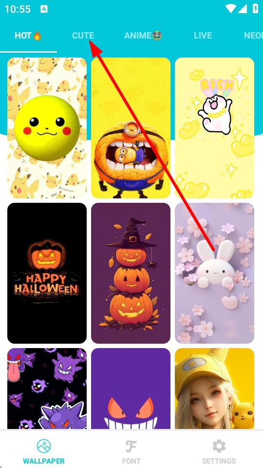2、在壁紙選擇頁面,點擊上方的CUTE分類標(biāo)簽,查看可愛風(fēng)格的壁紙。