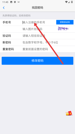 3、在進(jìn)入找回密碼頁(yè)面中,先點(diǎn)擊輸入框填寫(xiě)手機(jī)號(hào)和圖片驗(yàn)證碼,以便獲取短信。