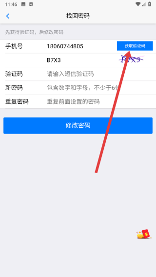 4、在填寫(xiě)好上述信息,點(diǎn)擊獲取驗(yàn)證碼按鈕后,即可填寫(xiě)驗(yàn)證碼和新密碼完成修改操作。