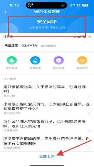 4、測速后顯示安全網(wǎng)絡(luò),再點(diǎn)擊正下方的立即上網(wǎng)的功能按鈕。