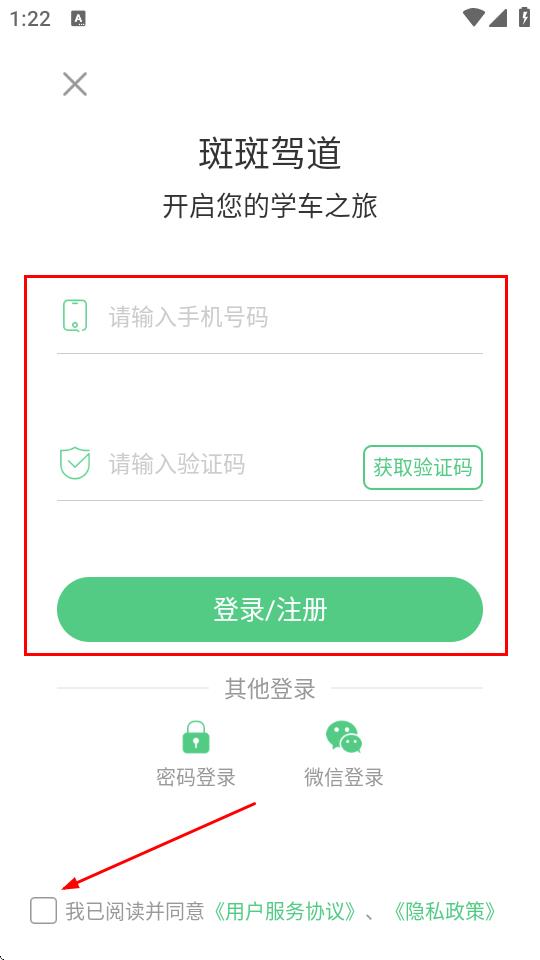 4、在登錄界面,勾選我已閱讀并同意用戶服務(wù)協(xié)議、隱私政策,輸入手機(jī)號碼,填入驗(yàn)證碼,點(diǎn)擊登錄/注冊按鈕完成登錄。