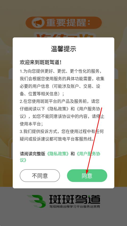 1、打開斑斑駕道APP,在彈出的溫馨提示窗口中,點(diǎn)擊同意按鈕,進(jìn)入APP主界面。