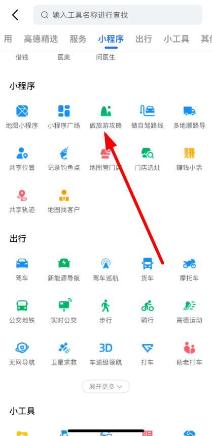 1、打開高德地圖,點擊我的,找到更多工具并點擊,在小程序板塊里選擇做旅游攻略。