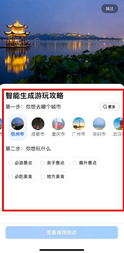 2、進入智能生成游玩攻略界面,第一步選擇想去的城市,第二步選擇想游玩的類型,比如必游景點、必吃美食等。