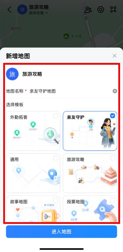 3、點擊相關(guān)選項新增地圖,自定義地圖名稱,選擇模板如親友守護、旅游攻略等,進入地圖后進一步完善旅游攻略內(nèi)容。