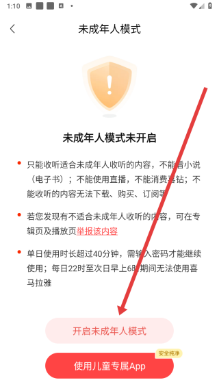 3、在進入到未成年人模式頁面后,可以點擊下方開啟未成年人模式按鈕,開啟模式。