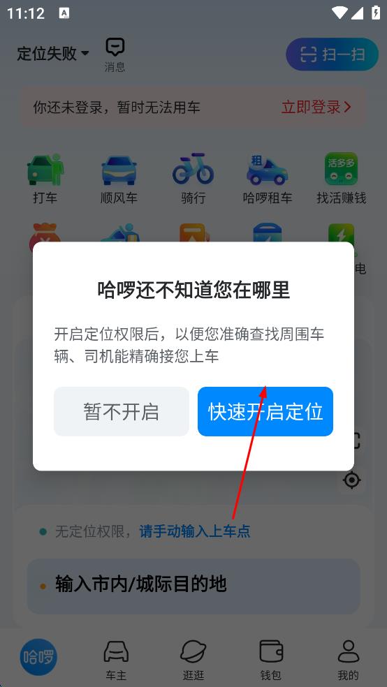 2、若定位失敗,會彈出哈啰還不知道您在哪里提示框,點擊快速開啟定位按鈕,開啟定位權限以便準確查找周圍車輛。