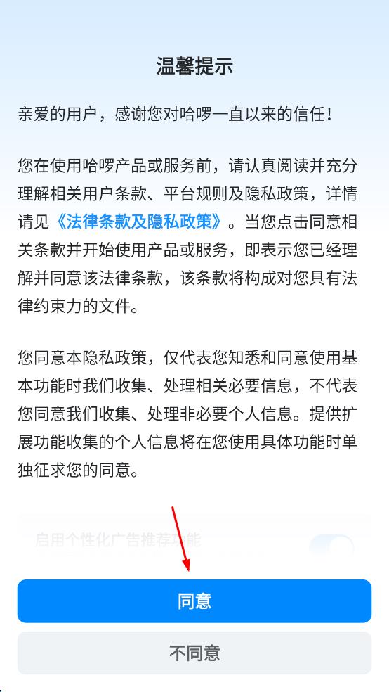 1、打開哈啰應用,出現溫馨提示界面,點擊同意按鈕,確認相關用戶條款、平臺規(guī)則及隱私政策,進入應用主界面。