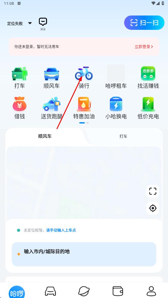 3、在應用主界面,找到騎行圖標并點擊,進入騎行功能頁面,即可進行后續(xù)掃碼用車等騎行相關操作。