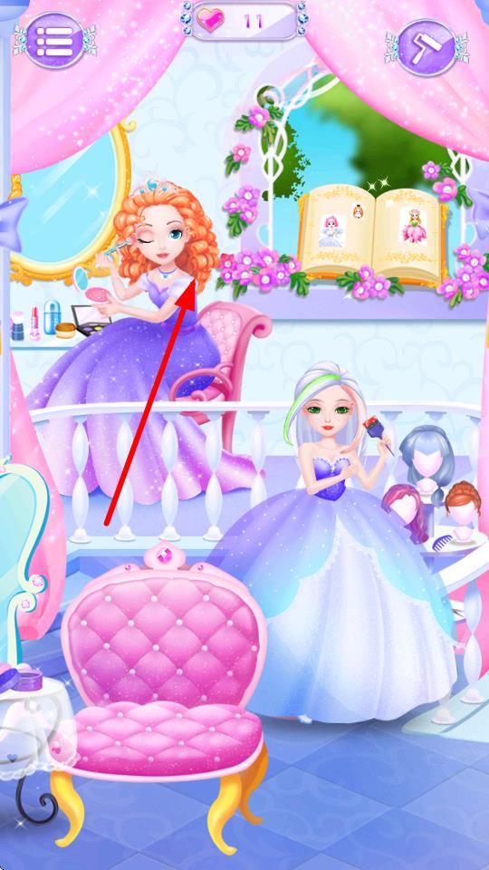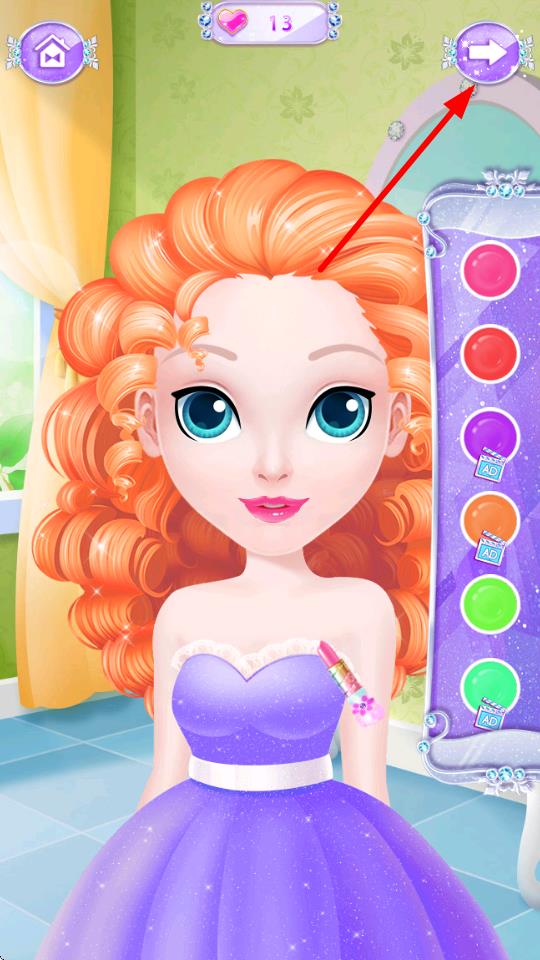 2、當(dāng)公主妝容初步完成后,點擊畫面右上方帶有箭頭標(biāo)識的按鈕,切換到更多造型設(shè)計場景,拓展造型搭配的可能性。