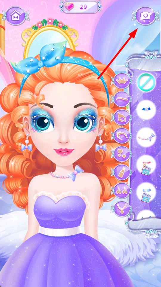 3、完成公主的整體妝容和造型設(shè)計后,點擊畫面右上方的相機圖標(biāo),對精心裝扮好的公主進行拍照留念,保存下美麗的造型成果。