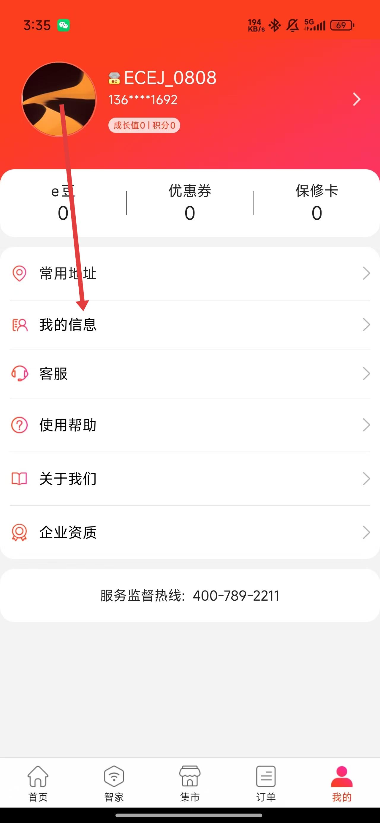 1、在e城e家我的主頁中,點(diǎn)擊我的信息選項(xiàng)可進(jìn)入查看或更改信息。