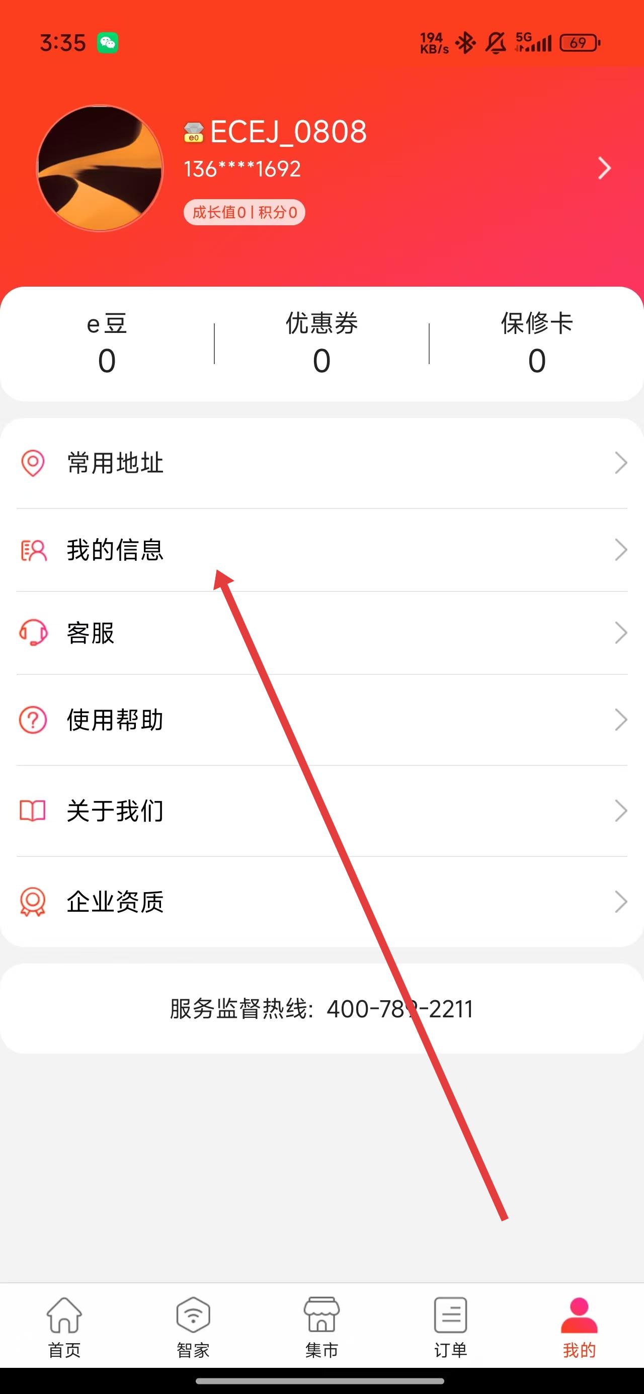 1、在e城e家app我的主頁中,可以通過點擊我的信息選項進(jìn)入更改信息設(shè)置。