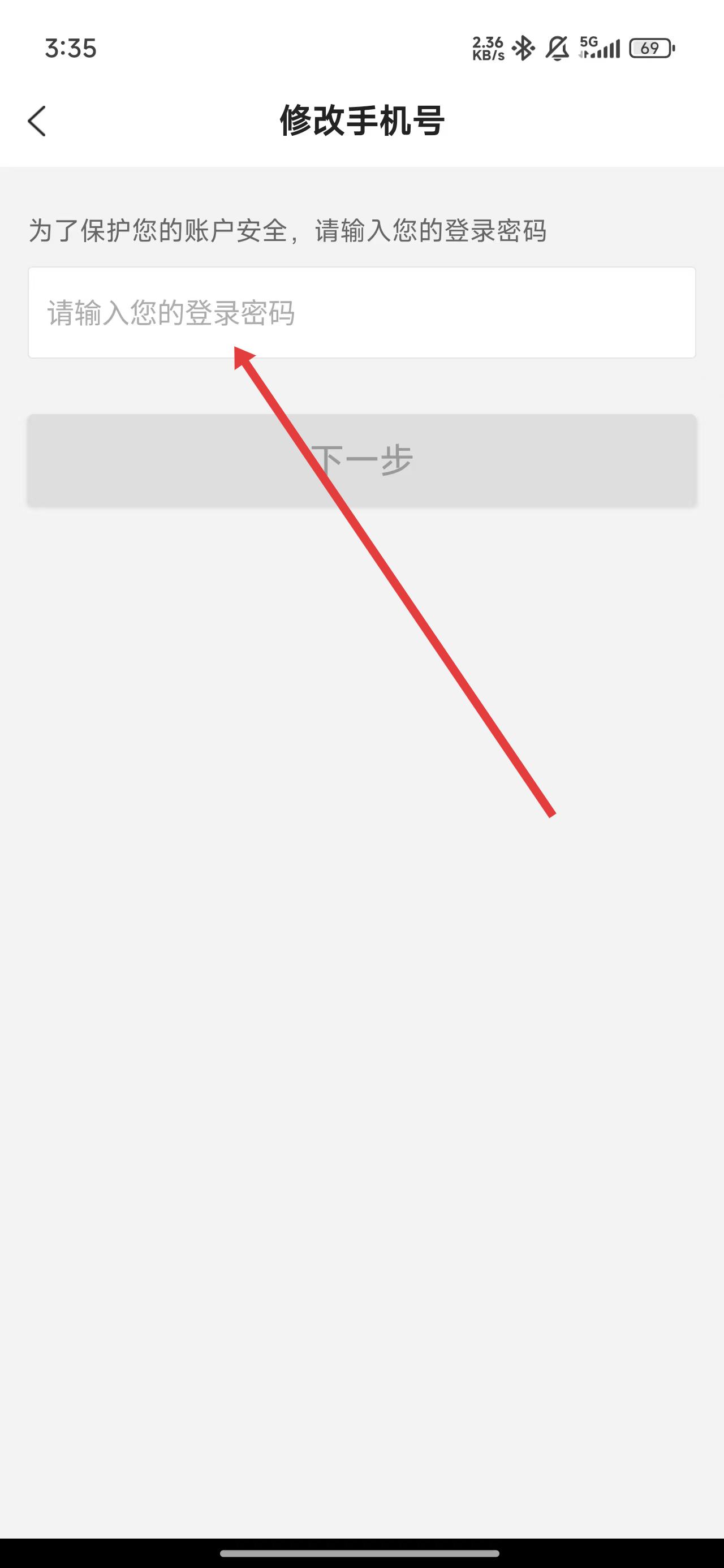 3、在修改手機(jī)號操作頁面中,點擊輸入框輸入登錄密碼后,進(jìn)行修改操作。