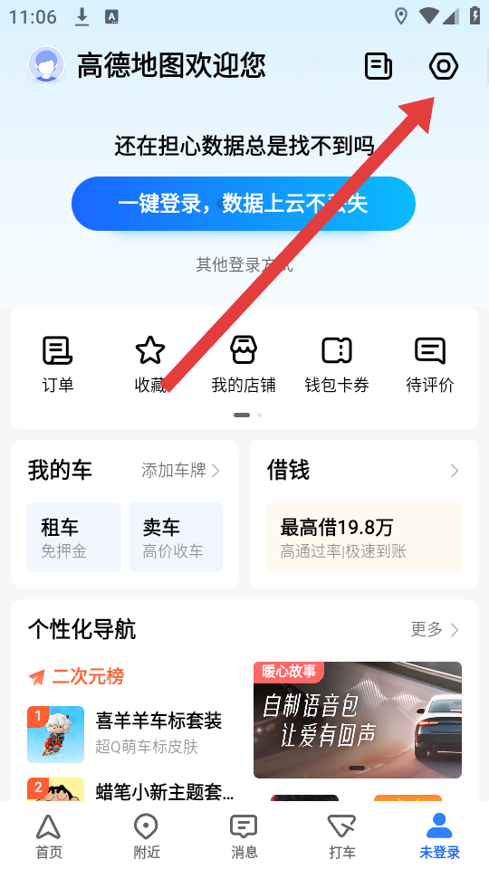 1、打開高德地圖APP,進入底部我的頁面,點擊右上角設置圖標,進入設置界面,開啟聲音提示關閉的操作流程。