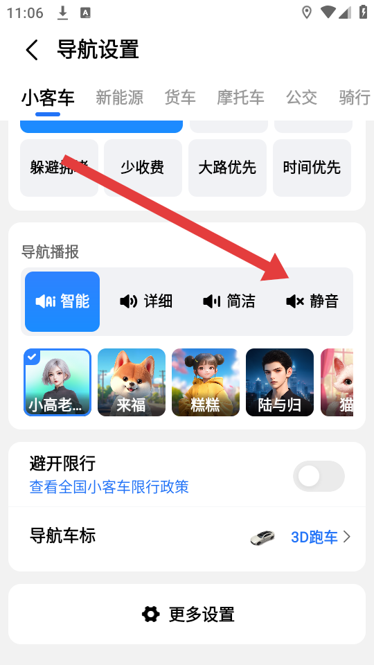 3、在導航設置頁面的導航播報板塊,選擇靜音的模式,即可關閉高德導航的聲音提示,讓導航過程安靜無擾。