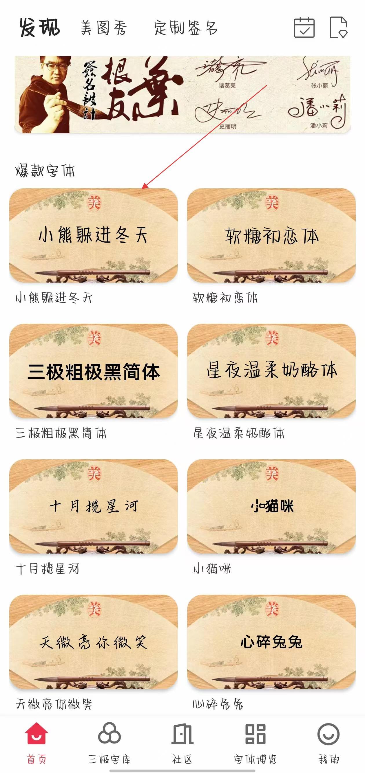 1、打開(kāi)字體美化大師App,進(jìn)入首頁(yè)點(diǎn)擊下方三極字庫(kù)或者字體博覽選項(xiàng),在頁(yè)面中瀏覽選擇喜歡的字體,比如點(diǎn)擊小熊躲進(jìn)冬天字體。