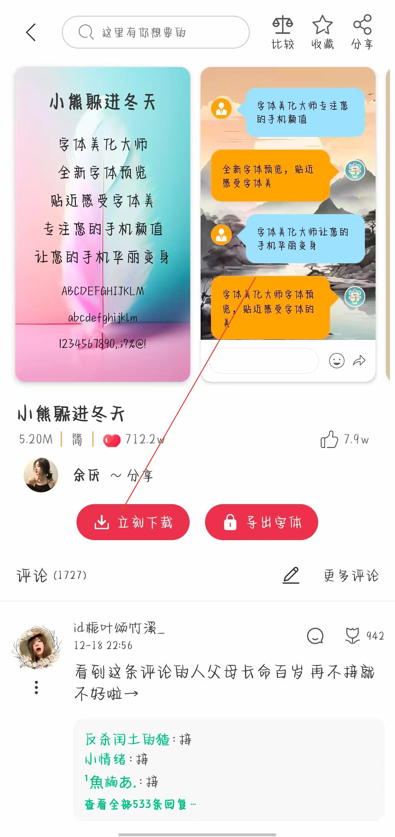 2、進(jìn)入所選字體的詳情頁(yè)面,點(diǎn)擊立刻下載按鈕,等待字體下載完成。