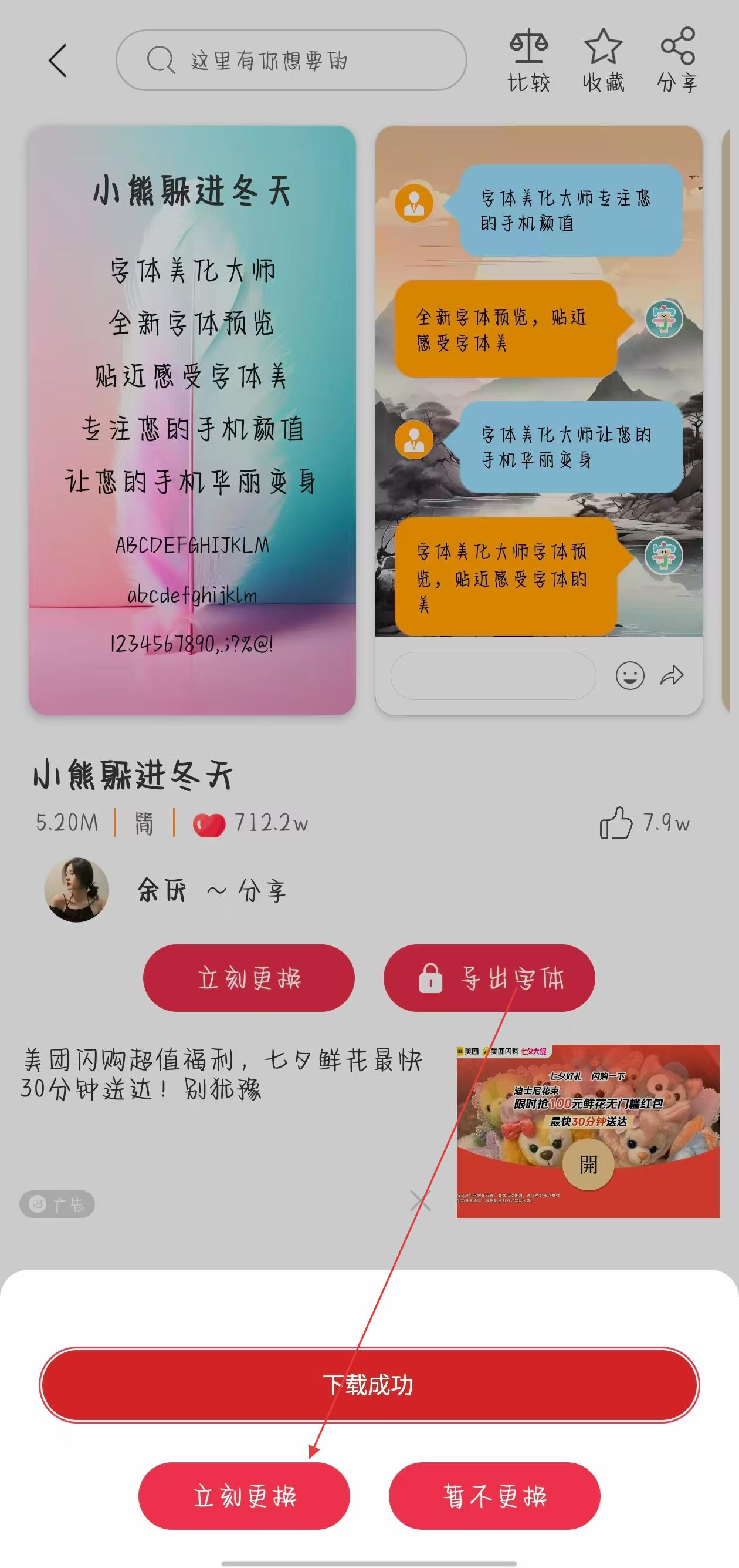 3、字體下載成功后,會(huì)出現(xiàn)立刻更換和暫不更換按鈕,點(diǎn)擊立刻更換,即可將手機(jī)當(dāng)前字體更換為剛剛下載的字體。