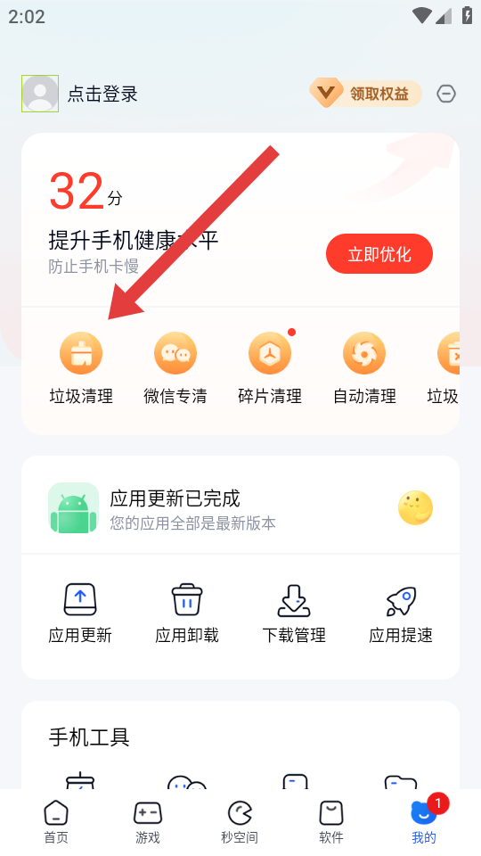 1、打開360手機(jī)助手APP,進(jìn)入我的頁面,點(diǎn)擊垃圾清理選項(xiàng)的圖標(biāo),進(jìn)入手機(jī)清理掃描界面。