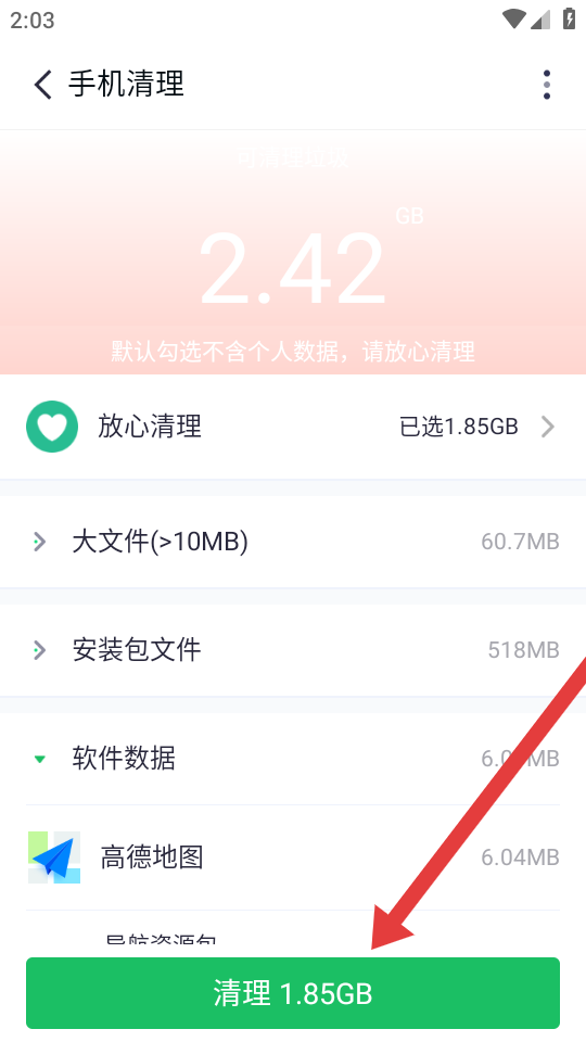 2、等待系統(tǒng)自動掃描垃圾文件如緩存、殘留安裝包等,掃描完成后點(diǎn)擊底部綠色清理X.XGB按鈕,開始清理選中的垃圾。