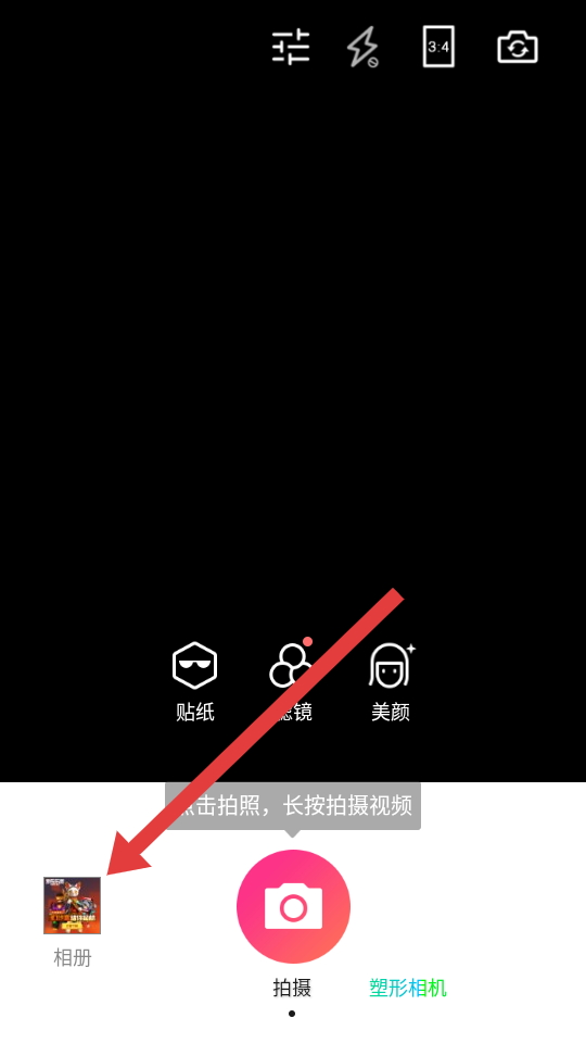 1、在潮自拍相機(jī)界面左下角,點擊相冊,進(jìn)入手機(jī)相冊選擇要編輯的圖片。
