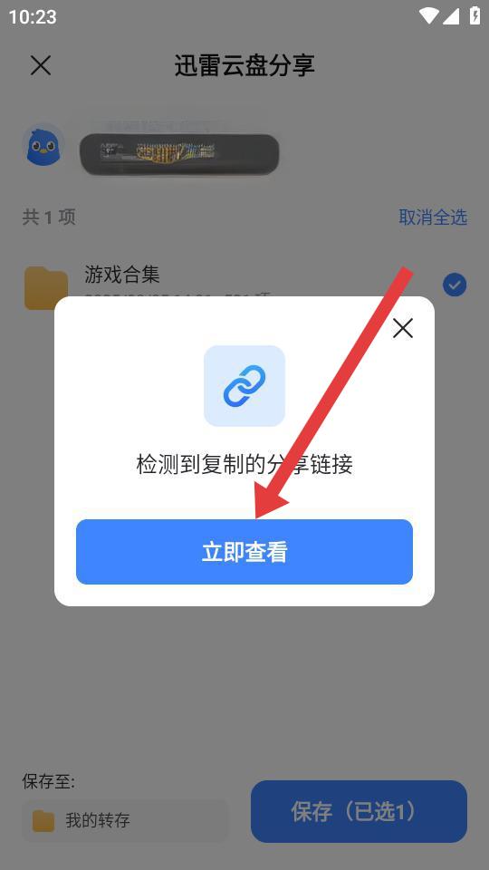 1、復(fù)制迅雷云盤分享鏈接后,打開迅雷APP,在彈出的檢測到復(fù)制的分享鏈接提示框中點(diǎn)擊立即查看,進(jìn)入分享內(nèi)容頁面。