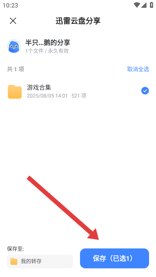 2、在迅雷云盤分享頁面,勾選要轉(zhuǎn)存的文件夾如游戲合集,點(diǎn)擊底部保存已選1按鈕。