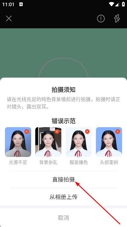 3、選擇尺寸后,點(diǎn)擊拍攝按鈕,彈出選項(xiàng),點(diǎn)擊直接拍攝。
