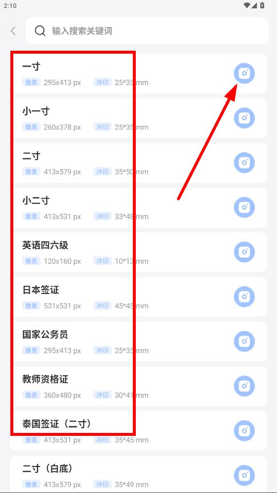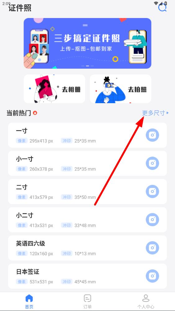 1、打開(kāi)寸照拍攝APP進(jìn)入證件照界面,點(diǎn)擊更多尺寸查看更多規(guī)格。