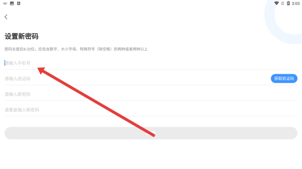 3、在設(shè)置新密碼頁面,先在輸入手機號欄填寫已注冊的手機號碼,為后續(xù)獲取驗證碼、設(shè)置新密碼做好準備,推進密碼重置步驟。
