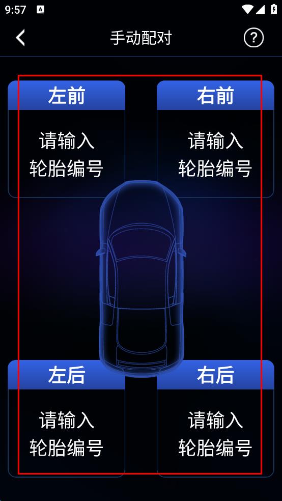 4、進(jìn)入“手動(dòng)配對(duì)”頁面,在左前、右前、左后、右后四個(gè)輪胎對(duì)應(yīng)的“請(qǐng)輸入輪胎編號(hào)”輸入框中,依次輸入相應(yīng)的輪胎編號(hào),完成設(shè)備綁定。