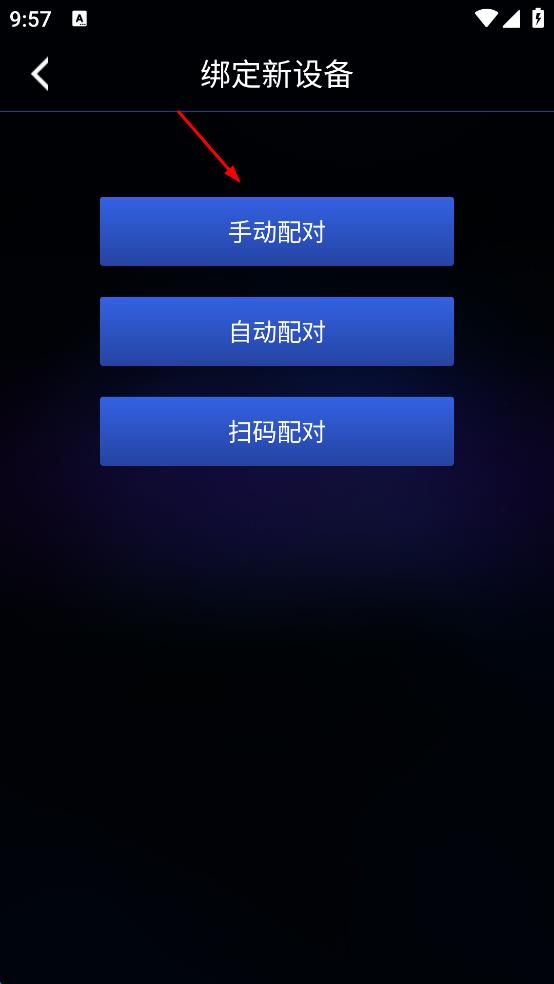 3、進(jìn)入“綁定新設(shè)備”頁面,在“手動(dòng)配對(duì)”“自動(dòng)配對(duì)”“掃碼配對(duì)”三個(gè)選項(xiàng)中,點(diǎn)擊“手動(dòng)配對(duì)”選項(xiàng)。
