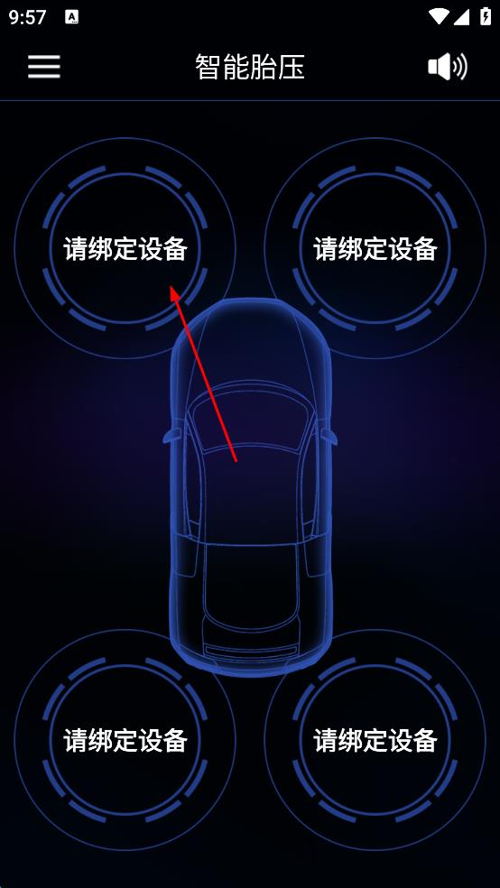 2、進(jìn)入“智能胎壓”頁面,看到汽車四個(gè)輪胎位置顯示“請(qǐng)綁定設(shè)備”,點(diǎn)擊任意一個(gè)“請(qǐng)綁定設(shè)備”區(qū)域。