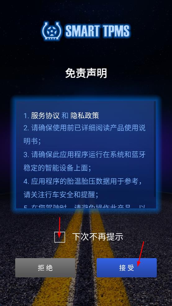 1、打開 SMART TPMS 應(yīng)用,在彈出的“免責(zé)聲明”窗口中,閱讀相關(guān)內(nèi)容后,點(diǎn)擊“接受”按鈕,若不想下次再看到該提示,可勾選“下次不再提示”。