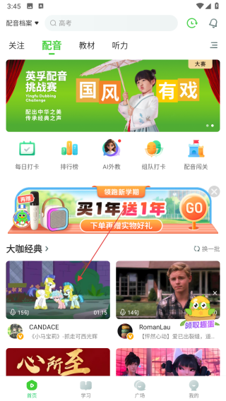 1、打開英語趣配音APP,在首頁配音板塊中,選擇心儀的配音視頻素材。