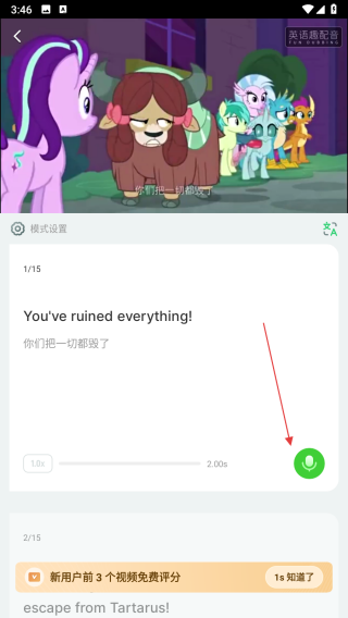 4、在配音頁面,看到英文臺詞后,點擊綠色麥克風(fēng)按鈕,跟隨視頻中的音頻節(jié)奏進(jìn)行配音錄制。